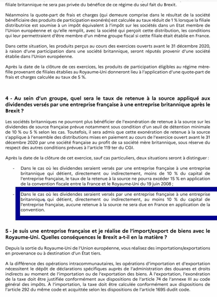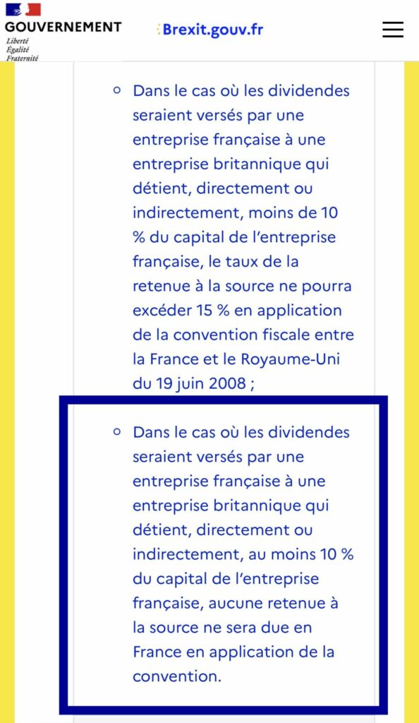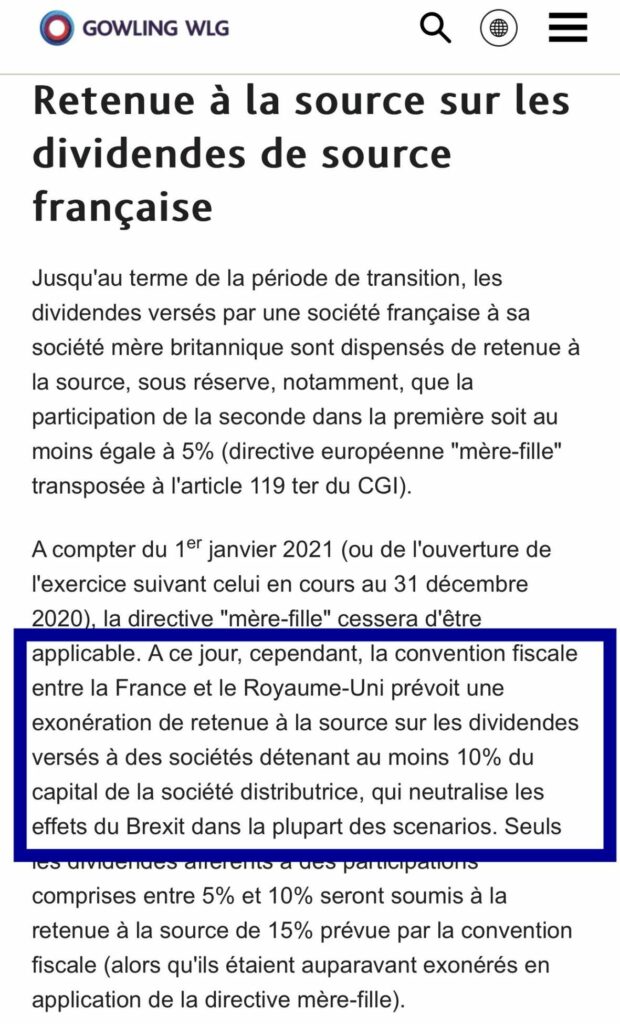 Cependant, il est essentiel de noter que les règles spécifiques peuvent varier en fonction de la législation en vigueur au moment de la réception des dividendes et des conventions fiscales applicables entre le Royaume-Uni et le pays où est établie la filiale.